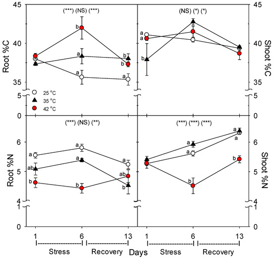 Effect of abrupt heat stress on the concentration of C and N in shoot (= leaves + stems) and roots of tomato (dry mass basis). Plants were grown at 25 °C/20 °C day/night (control), and then subsets of plants were heat stressed at 35 °C/30 °C or 42 °C/37 °C day/night for one or six days (maximum root temperatures = 32 °C or 39 °C), and then returned to control conditions for seven days of recovery (=day 13). Values are means ± 1 SE for four independent replicates from each harvest (days 1, 6, 13). Statistics are as in Figure 1. * p < 0.05, ** p < 0.01, *** p < 0.001.