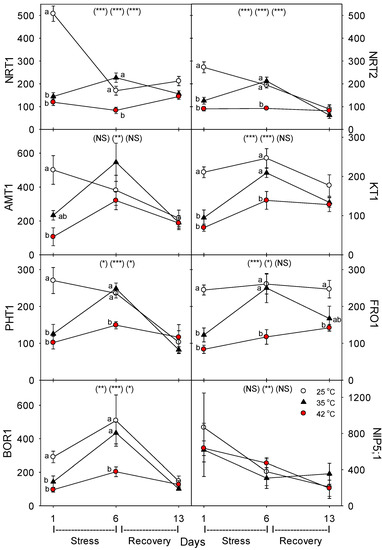 Effect of abrupt heat stress on relative levels of specific nutrient transport proteins (per g dry root) in roots of tomato: low-affinity NO3, NRT1; high-affinity NO3, NRT2; NH4, AMT1; K, KT1; P, PHT1; Fe, FRO1; B, BOR1 and NIP5;1. Plants were grown at 25 °C/20 °C day/night (control), and then subsets of plants were heat stressed at 35 °C/30 °C or 42 °C/37 °C day/night for one or six days (maximum root temperatures = 32 °C or 39 °C), and then returned to control conditions for seven days of recovery (=day 13). Values are means ± 1 SE for four independent replicates from each harvest (days 1, 6, 13). Statistics are as in Figure 1. * p < 0.05, ** p < 0.01, *** p < 0.001.