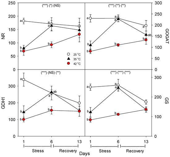 Effect of abrupt heat stress on relative levels of specific nutrient metabolism proteins (per g dry root) in roots of tomato: NR, nitrate reductase; GOGAT, glutamine oxoglutarate amino transferase; GDH1, glutamate dehydrogenase; GS, glutamine synthetase. Plants were grown at 25 °C/20 °C day/night (control), and then subsets of plants were heat stressed at 35 °C/30 °C or 42 °C/37 °C day/night for one or six days (maximum root temperatures = 32 °C or 39 °C), and then returned to control conditions for seven days of recovery (=day 13). Values are means ± 1 SE for four independent replicates from each harvest (days 1, 6, 13). Statistics are as in Figure 1. * p < 0.05, ** p < 0.01, *** p < 0.001.