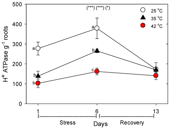 Effect of abrupt heat stress on relative levels of the plasmalemma H+-ATPases (per g dry root) in roots of tomato. Plants were grown at 25 °C/20 °C day/night (control), and then subsets of plants were heat stressed at 35 °C/30 °C or 42 °C/37 °C day/night for one or six days (maximum root temperatures = 32 °C or 39 °C), and then returned to control conditions for seven days of recovery (=day 13). Values are means ± 1 SE for four independent replicates from each harvest (days 1, 6, 13). Statistics are as in Figure 1. * p < 0.05, ** p < 0.01, *** p < 0.001.