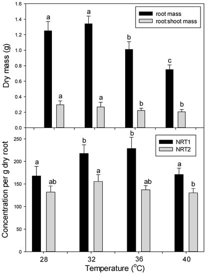 As in the first main experiment (six days at 35 °C or 42 °C), root mass and root:shoot mass ratio decreased at high temperatures (15 days at 36 °C and 40 °C vs. 28 °C and 32 °C) (Figure 8). Also, as in the first experiment, the concentration of NRT1 and NRT2 decreased only at very high temperature (40 °C) (Figure 9).