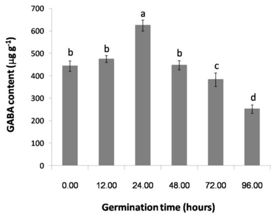 We reported that GABA accumulation in germinated rice was detected at 12 h duration, and the highest content was about 1.4-fold that obtained from the rice germinated for 24 h compared with 0 h (Figure 1). The accumulation of GABA after the highest value at a 24-h germination duration rapidly decreased, and the lowest content occurring at 96 h was 2.5-fold lower than that at 24 h. As previously reported, Karladee and Suriyong [26] found for that almost 21 rice varieties, including the upland rice varieties, the highest GABA accumulation was obtained from rice germinated for 24 h. A slight difference was observed from a study of Indica and Japonica rice, in which the highest GABA accumulations were detected at 36 h for both rice genotypes. At the peak of GABA accumulation, Indica rice seems to have a higher GABA accumulation than Japonica rice, while the glutamate decarboxylase activity (GAD) of both rice genotypes appeared in the highest value at 24 h [19].