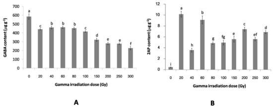 The germinated rice at 24 h (non-irradiated rice and irradiated rice) was used to observe the effect of gamma irradiation on GABA and 2AP levels. Our observation shows that the GABA content of the irradiated rice significantly (p < 0.05) decreased with all gamma doses compared with the non-irradiated rice. At the gamma dose of ≥200 Gy, the GABA content of the irradiated rice decreased approximately twice as much as in the case of the non-irradiated rice. On the other hand, the 2AP content of the irradiated rice increased with all gamma doses, and the increase was approximately eight-fold to 23-fold higher than those of the non-irradiated rice. Moreover, the highest 2AP level of 10.28 ± 0.53 μg g−1 was obtained at 20 Gy (Figure 2).