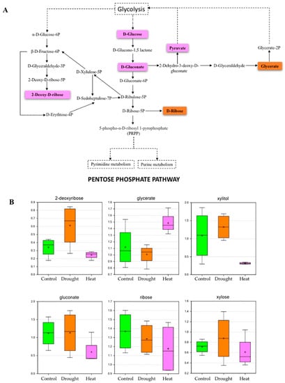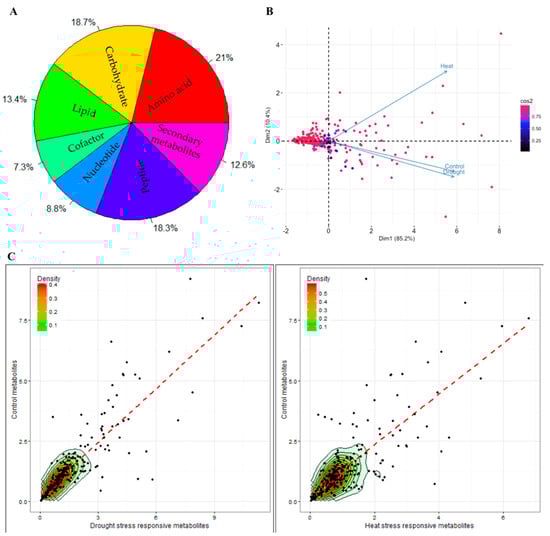 2.1. Differential Expression of Metabolites in Response to Heat and Drought Stress