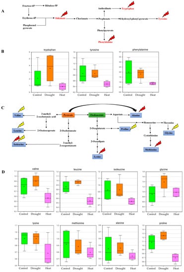 2.3. Effect of Drought and Heat Stress on Amino Acid Metabolism