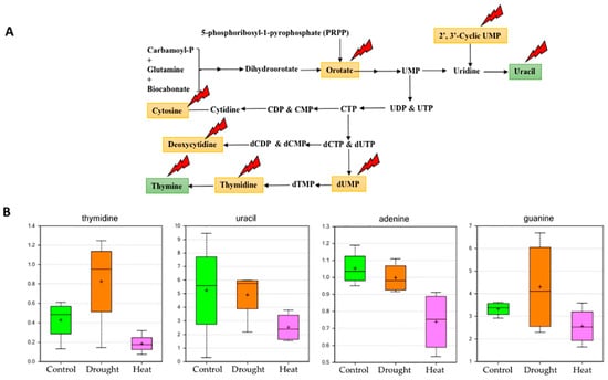 2.6. Effect of Drought and Heat Stress on Nucleotide Metabolism and Protein Synthesis
