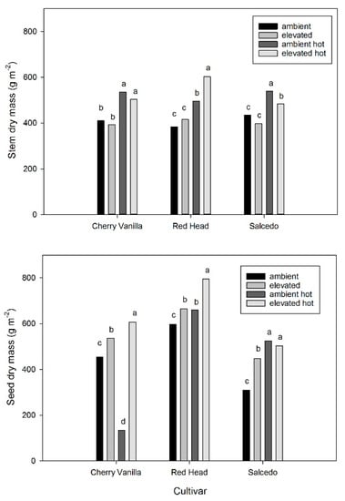 A total of eight different controlled environment chambers were utilized, with treatments randomly assigned to chambers over a span of 24 months. There were three replicate chambers per treatment per cultivar, with five or six plants per treatment replicate per cultivar. At seed maturity, the aboveground biomass of each plant was separately dried at 70 °C in a forced air oven, and seed and stem dry mass were separated and weighed. Any remaining leaf material was discarded. Harvest index was calculated as the seed dry mass divided by the total seed and stem dry mass. Analysis of variance was conducted using the three chamber replicates of each treatment and cultivar. Because ANOVA indicated a significant Cultivar × CO2 × Temperature interaction (p = 0.023) for seed mass, the CO2 and temperature treatments were analyzed separately for each cultivar.