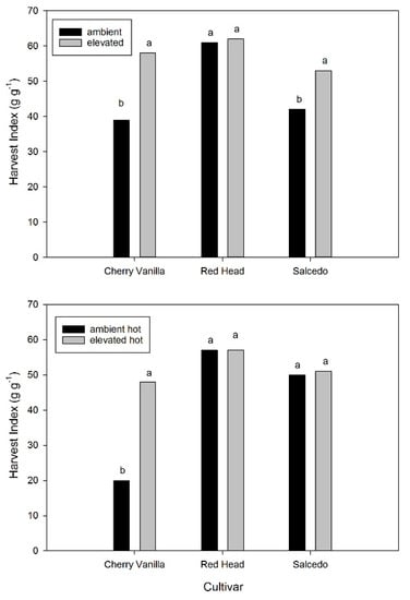 Harvest index (seed dry mass/total aboveground dry mass) at final harvest for three cultivars of quinoa grown at ambient (400 μmol·mol−1) or elevated (600 μmol·mol−1) CO2 concentrations, with or without a high temperature treatment for 7 days beginning at anthesis. The control growth day/night temperatures were 20/14 °C, and the high temperature treatment was 35/29 °C. Within cultivars and temperature treatments, different letters indicate significant differences in mean values, based on ANOVA.