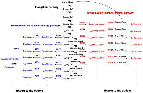 After elongation, acyl-CoAs are modified on two branch pathways: on the alkane-forming pathway, the CER3 and CER1 enzymes consecutively reduce and decarbonylate acyls, into aldehydes with predominantly even carbon numbers, and alkanes one carbon shorter, and thus odd C-numbers, respectively [26,27,28] (Figure 3). The alkanes may be converted into secondary alcohols and ketones by the mid-chain alkane hydroxylase1 (MAH1) [29]. On the alcohol-forming pathway, fatty acyl-CoA reductases (FARs) form even-numbered n-alcohols [30], which can be converted into alkyl esters by the wax synthase/diacylglycerol acyltransferase1 (WSD1) enzyme [31] (Figure 3).