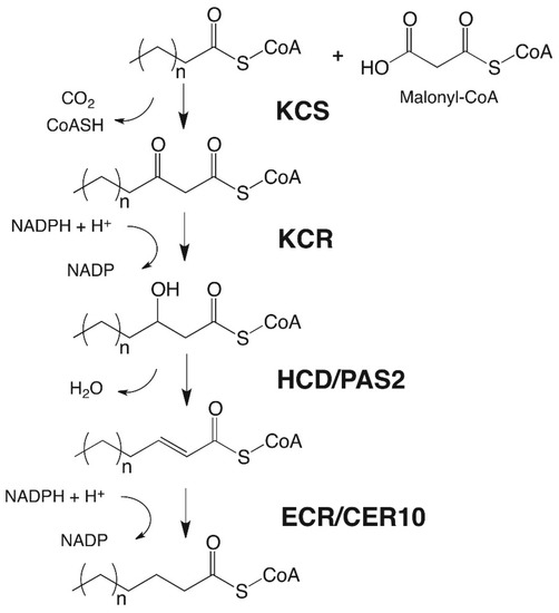 Each elongation cycle is carried out by a fatty acid elongase (FAE), an enzyme complex catalyzing four sequential reactions effecting the overall extension of the hydrocarbon chain by two carbons (Figure 3 and Figure 4). In each cycle, first a β-ketoacyl-CoA synthase (KCS) fuses the incoming chain with a C2 unit from malonate, and then a β-ketoacyl-CoA reductase (KCR), a β-hydroxyacyl-CoA dehydratase (HCD), and an enoyl-CoA reductase (ECR) reduce the functional group of the intermediate into a methylene (CH2) unit [14,15,16,17,18,19,20] (Figure 4). The initial condensing reaction, catalyzed by KCS enzymes, is the rate-limiting step and determines the chain length range of substrates and products of the FAE complex [19], while the other three FAE enzymes, the KCR, HCD, and ECR, are used ubiquitously by all FAE complexes [19,21]. It is likely that different FAEs co-exist within one cell, together generating a broad chain length range of acyls with predominantly even carbon numbers. Based on Arabidopsis ksc mutant analyses, the KCS enzyme KCS6/CER6 was found to be central for cuticular wax biosynthesis, as it elongates C24 to C28 acyl-CoAs. More recently, it was shown that the KCS6/CER6 FAE complex may be associated with CER2-LIKE proteins, then enabling elongation of acyl-CoAs up to C34 (Figure 3), yet the mechanism of action of CER2-LIKE proteins remains unknown [22,23,24,25].