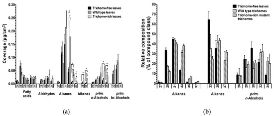First quantitative distinctions between pavement and trichome surface compositions were enabled by Arabidopsis mutant studies [6]. In these experiments, compositions of cuticular waxes were compared between the trichome-free gl1 mutant, the wild type, and the trichome-rich mutant cpc tcl1 etc1 etc3. The leaf wax of the trichome-rich mutant contained higher amounts of C32–C37 wax compounds compared to the wild type and trichome-free mutant (Figure 5a). The shifts in chain length distributions occurred within all major compound classes, irrespective of their functional groups, whereas the absolute amounts of the compound classes were not significantly different between lines with different trichome numbers. Moreover, the stem waxes of the trichome mutant lines showed similar effects to those observed for leaves, albeit with increases mainly in C32 and C33 compounds [6]. Overall, these results revealed a correlation between the abundances of trichomes and extremely long-chain aliphatic compounds. Pavement and trichome waxes were, thus, found to differ in their chain length profiles.