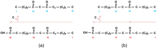 Structure and IUPAC (blue) nomenclature of β-diketones compared to their biosynthetic nomenclature (red). (a) Hentriacontane-14,16-dione (C31) is derived from 16,18-dioxodotriacontanoic acid by loss of a carbon. Horizontal dashed red arrow denotes direction of synthesis by successive additions of C2-units. (b) Triacontane-14,16-dione (C30) is similarly derived from 15,17-dioxohentriacontanoic acid. Solid red arrow denotes pentadecanoic acid (C15) that is extended by C2-units as indicated by dashed red arrow.