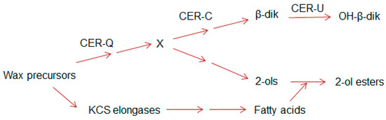 Sites of action of the Cer-c, -q and –u encoded proteins based on compositional analyses of the waxes of wild type and cer mutants with CER-U functioning as a hydroxylase; simplified from [16]. X denotes a common precursor for both the β-diketone aliphatics and the esterified alkan-2-ols. KCS elongases denote the elongation systems giving rise to the ubiquitous wax aliphatics.