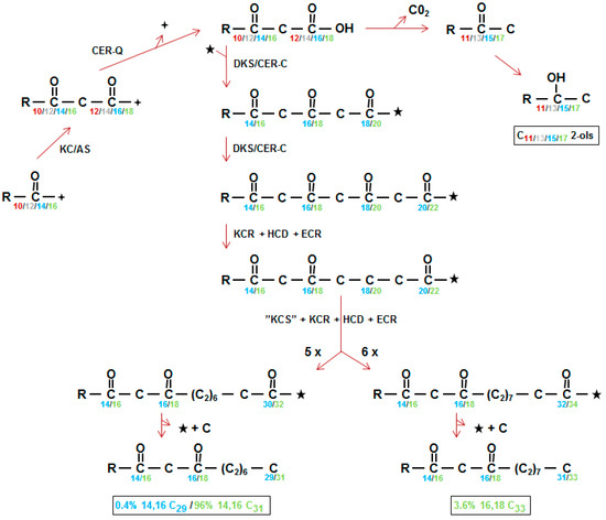 The polyketide pathway synthesizing β-diketones and alkan-2-ols. (Left, middle) KC/AS, either KCS, one of the β-ketoacyl-CoA synthases constructing carbon chains of the ubiquitous wax aliphatics in the endoplasmic reticulum or KAS, the β-ketoacyl-ACP synthase participating in fatty acid synthesis in plastids. CER-Q, a lipase/carboxyl transferase/thioesterase which is envisaged to hydrolyze the 3-oxo substrate (top, center) from ACP, CoA or lipid (