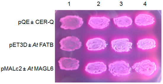 HvCER-Q as the AtFATB thioesterase, and AtMAGL6 lipase expressed in Escherichia coli K27 (fadD88) on MacConkey plates excrete free acids into the medium that the pQE80, pET3D and pMAL-c2 vectors, respectively, do not. Lane 1, empty vectors; lanes 2, 3 and 4, vector plus designated insert in three independent transformants. Plates contained 0.5% lactose, 100 μg. mL−1 ampicillin, and 0.3 mM IPTG and was placed at 30 °C for 20 h.