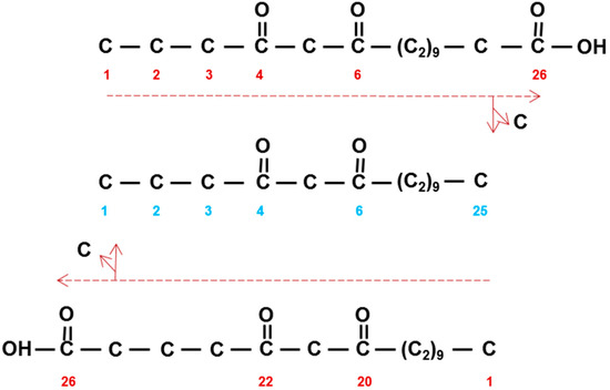 Nomenclature and possible synthesis of the carbon skeleton of pentacoasane-4,6-dione (middle). Synthesis (horizontal red arrows and numbers) in direction of (top) and in opposite direction of (bottom) IUPAC nomenclature (blue numbers). Vertical arrows show loss of carbon to give the C25 dione.