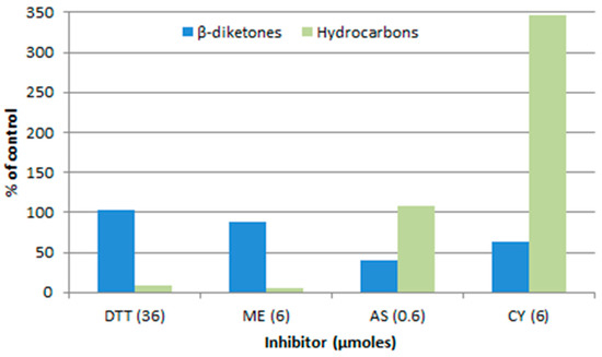 Preincubation with inhibitors affects the amount of label incorporated into the β-diketones and hydrocarbons of cer-u.69 spike wax from [2-14C]-acetate [37]. DTT, 1,4-dithiothreitol; ME, 2-mercaptoethanol; AS, sodium arsenite; CY, potassium cyanide.