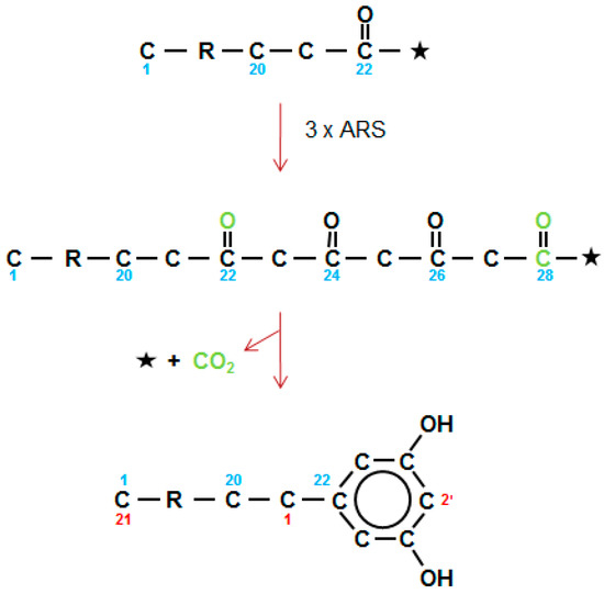 Already in 1974, Briggs [59] observed that the sum of the carbons in the alkyl chain plus the benzene ring of the ARs are similar to those of the alkanes present in the wax collected from the testa of barley grains. Four major homologs were identified, as well as a minor series with the potential to be branched ARs. More recently, homologous series of both ARs and methylARs (MARs), in approximately equal amounts, with alkyl chains of 19–29 carbons, have been documented in wheat flag leaf and peduncle waxes [19,60]. A similar AR series occurs in rye cuticular wax, but not in the epicuticular wax [61]. Quinoa grains have recently been shown to have a very complex mixture of ARs, including MARs, branched chain, unsaturated and even chain members [62]. The first AR synthase (ARS) genes (which are type III PKS-like) in plants, were cloned from sorghum and rice [20]. They included ARS1 and ARS2 from sorghum, plus three from rice. Among the acyl-CoA substrates used by ARS1 and ARS2 were C16 acyl-CoA chains with three double bonds that formed the C22 1,3,5,7-tetraketide precursor of sorgoleone. Given an analogous pathway for the ARs in barley and wheat wax, then C14–30 saturated CoAs are used to form C20–36 tetraketides, which then undergo an aldol C2 → C7 condensation, with elimination of a CO2 (Figure 8), as carried out by ARS1 and ARS2, and also by stilbene synthases (STSs). For the MARs, one of the three condensations giving rise to the tetraketide, presumably uses methylmalonyl-CoA as an extender, instead of malonyl-CoA. In quinoa, this is the second of the three ARS extensions, as nuclear magnetic resonance located the methyl group in position 2′ of the resorcinol ring [62].