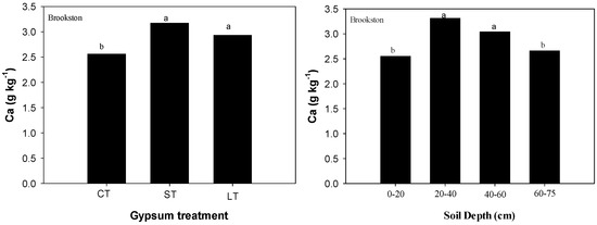 For total carbon, the interaction of gypsum treatment by depth was statistically significant (p < 0.0001) in both soils (Table 1). In the Brookston soil, higher TC values were found for the ST-gypsum treatment in the 0–20 and 20–40 cm depths (TC >20.0 g kg−1) but values decreased dramatically below 40 cm (TC <6.7 g·kg−1) when compared with the other two treatments (13 < TC > 7 g·kg−1) (Table 2). No consistent response of TC was observed in the surface soil layer for the gypsum-treated Celina soil (Table 2). However, ST and LT-gypsum treated Celina soils had higher TC (4.60 and 4.78%, respectively) for the deeper horizons (60–75 cm) when compared with CT soils at the same depths (3.06%) due to presence of calcium carbonates. Soil under the LT-gypsum treatment had higher calcite (calcium carbonates) content as a percentage (%) of total C (8.1 ± 1.1) than the soil under the ST-gypsum treatment (3.9 ± 0.3) and CT soil (1.3 ± 0.2) [23]. Wang and Anderson [26] found applying water with high electrolyte concentration due to presence of gypsum to a calcareous system could increase the calcium concentration in solution above calcite equilibrium, dissolve Ca, Mg and carbonates under saturated conditions, and precipitate some of the dissolution products as secondary carbonates under unsaturated conditions.