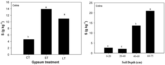 Sulphur mean values of Celina soils for each gypsum treatment (left) and in each soil layer (right). Means followed by the same letter or no letters for each soil and soil layer are not significantly different by Tukey’s test at p < 0.05.