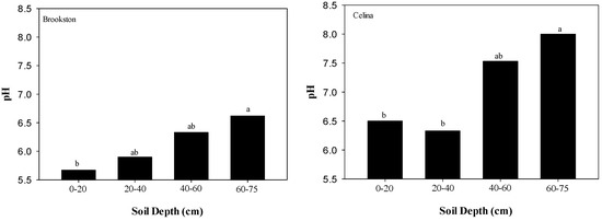 pH values of Brookston and Celina soils in each soil layer. Means followed by the same letter or no letters for each soil and soil layer are not significantly different by Tukey’s test at p < 0.05.