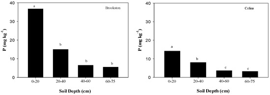 No differences in soil pH were observed among gypsum treatments for each soil depth (Table 1); although pH increased with depth in both soils (p = 0.03) (Table 1, Figure 3). Also, long-term surface applications of gypsum to Brookston (0.36 dS m−1) and Celina (0.39 dS m−1) soils did not result in significantly different EC values compared to CT soils (0.54 and 0.46 dS m−1 for Brookston and Celina, respectively) (Table 1). Studies by Farina and Channon [24], Toma et al. [17], and Caires et al. [25] found minimal or no effect on soil pH when gypsum was applied to soil systems dominated by permanent charges. Bray-1 P was statistically different for soil depth in both soils (p < 0.001) (Table 1). The highest Bray-1 P was found at the 0–20 cm depth of both soils (Figure 4). However, values decreased with depth in both soils (Figure 4).