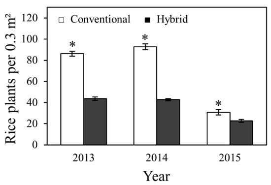 Mean rice stand per 0.3 m2 (±SEM) of conventional and hybrid varieties in 2013, 2014, and 2015. An asterisk denotes a significant main effect of variety (P < 0.05; Tukey’s HSD).