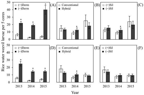 The larval stage is the most destructive developmental stage of the rice water weevil. Root feeding by weevil larvae can cause significant yield losses [,]. Core samplings were performed three and four weeks after permanent flooding to determine larval densities in the field. Data were analyzed separately by core sampling and year. In both the first and second core samplings, larval densities were significantly reduced (P < 0.05) in Dermacor-treated rice plots in 2013, 2014, and 2015, compared to untreated rice plots (Figure 2A,D and Table 1). The effect of variety on weevil densities was not significant in 2013 and 2015; however, significantly higher (P < 0.05) weevil densities were observed on the hybrid variety in both core samplings in 2014 (Figure 2B,E and Table 1). Weevil densities were not affected by silicon amendment in 2013 and 2015 (Table 1). In 2014, significantly lower larval densities (P < 0.05) were observed in silicon-treated plots in the first core sampling but not the second (Figure 2C,F). There was a significant interaction (P < 0.05) between Dermacor treatment and variety in the first and second core samplings in 2013 and 2015 (Table 1). The interaction between Dermacor treatment and variety in 2013 and 2015 suggests that when rice plots are left untreated with Dermacor, rice water weevil larval densities tend to be higher in plots seeded with the conventional variety than hybrid plots (Figure A1, in Appendix A). When rice seeds were treated with Dermacor, reductions in rice water weevil larval densities are similar between varieties.