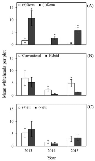 Main effects of Dermacor seed treatment, variety, and silicon amendment on whiteheads. (A) main effect of Dermacor treatment; (B) main effect of variety; (C) main effect of silicon amendment in 2013, 2014, and 2015. For each year, bars accompanied by asterisks designate significant difference (P < 0.02; Tukey’s HSD). The bars represent standard error of means (SEM).