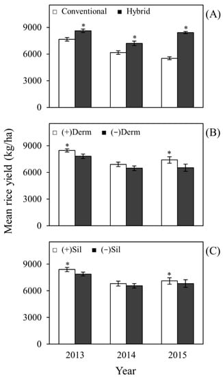 Despite the lack of effects of silicon on insects, yields were affected by silicon treatment. Silicon amendment significantly improved rice yields in 2013 and 2015 (Figure 4) by 6.6% and 4.4%, respectively, compared to untreated plots. Beneficial effects of silicon on crop yield have been previously documented. Field trials conducted in Japan has resulted in an increase in the number of panicles and an up to 17% increase in rice yield due to silicon fertilization []. Application of silicon-containing materials also increased grain yield in wheat by 4.1–9.3% []. The increases in yield due to silicon (4.4–6.6%) were smaller than the increases due to use of Dermacor (8.4–13.5%) and the increases observed in hybrid plots over conventional plots (12.7–52.5%).