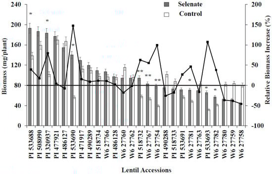 Variation in biomass and relative biomass change for 26 lentil genotypes during germination with added Se fertilizer. *, ** = Significant at p < 0.05 and p < 0.1, respectively. Relative biomass was calculated based on control biomass weight.