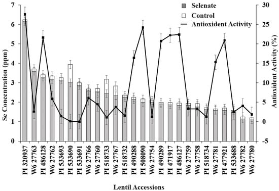 Se treatment significantly increased seedling biomass in nine lentil genotypes vs. the control (Figure 1). Similarly, relative biomass increased; specifically, PI320937, PI533690, PI518732, W627767, W627754, and PI533693 demonstrated biomass increases of more than 50% compared to their controls (Figure 1). Among these genotypes, PI533690 and PI533693 demonstrated a >100% biomass increase compared to controls. As expected, Se treatment (30 kg of Se/ha) significantly increased seedling Se concentration for all genotypes; PI320937 showed the highest Se uptake (6.2 µg g−1) and W627780 (1.1 µg g−1) the lowest (Figure 2). Antioxidant activity for the control treatments was below the detection limit (data not shown). More than 20% antioxidant activity was observed in seven genotypes: PI320937, PI486128, PI508090, PI490289, PI471917, PI486127, and PI477921 (Figure 2). In general, antioxidant activity increased with Se application but responses varied across genotypes.