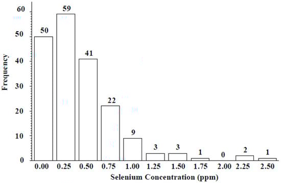 Success in lentil Se biofortification efforts is a function of broad genetic diversity, heritability, and selection abilities. The Se uptake capability of lentil, especially when grown in naturally low-Se soils, could be an important trait and therefore discovering useful genes or alleles for Se uptake is of interest. This paper is the first to our knowledge to report the natural diversity of seed Se levels for the largest wild lentil accession collection. Seed Se concentration varied with Lens species and country of origin. Seed Se concentration ranged from 0 to 2.45 µg g−1 for accessions originating from Syria, 0 to 2.35 µg g−1 for accessions from Turkey, and 0 to 0.91 µg g−1 for the other accessions (Table 4). Moreover, frequency distribution analysis clearly indicated approximately 59 wild accessions with 0.25 µg g−1 (low seed Se), 41 wild accessions with 0.5 µg g−1 (moderate seed Se), 22 accessions with 0.75 µg g−1 (high seed Se), and nine accessions with 1.00 µg g−1 (very high seed Se) of Se in their seed (Figure 3). Results from studies using molecular markers for lentil breeding efforts might have been limited due to the low genetic diversity among cultivated lentil species [,]. However, future genetic Se biofortification is possible by properly identifying genes or alleles responsible for Se uptake by using a larger and more diverse germplasm collection that includes wild accessions.