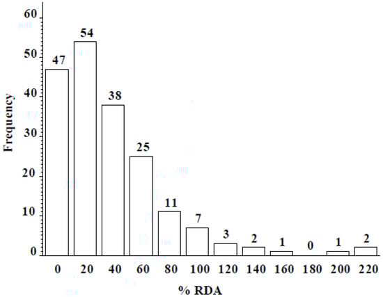 Frequency distribution of percent recommended daily allowance (%RDA: 55 µg/day for an adult) of Se from a 50-g serving of lentil seed from wild accessions grown in Lebanon.