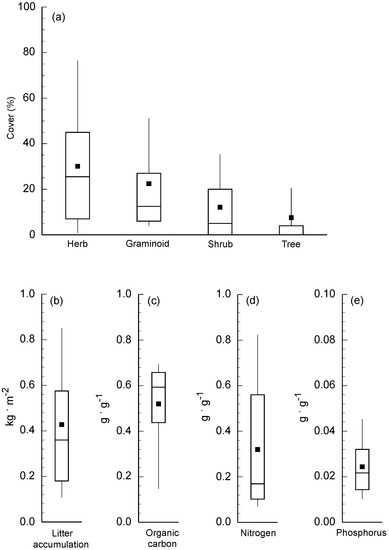 (a) Box-and-whisker plots showing percentage cover of plant life forms; (b) litter accumulation; (c–e) litter nutrient content for 54 sampling plots located along roadsides in Sichuan Basin, China. For each variable, the top, bottom, and middle lines of the box correspond to the 75th percentile, 25th percentile, and median, respectively; vertical lines extending from the bottom and top of the box correspond with the 10th and 90th percentile, respectively; and the black squares indicate the mean value. Note differences in y-axis scale.