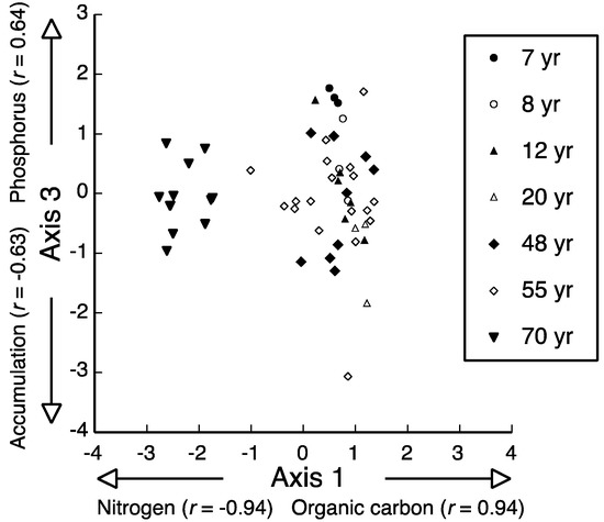 The PCA solution explained 94.2% of total variation among the 54 plots on three axes (Table 1). Axes were best defined by the following: axis 1, inverse relationship between litter N and organic carbon; axis 2, positive relationship between litter accumulation and P; and axis 3, inverse relationship between litter accumulation and P (Table 1). Ordination of PCA scores for axes 1 and 3 showed the most distinction among sampling plots. Axis 1 emphasized that litter N was higher and organic carbon was lower for sampling plots associated the longest period since road construction (i.e., 70 years; Figure 2). In addition, axis 3 featured high variability, both within and among sampling plots, for litter accumulation and P content; however, variation was relatively lower for plots associated with the shortest period since road construction, which tended to have higher organic carbon and P than the other roads.