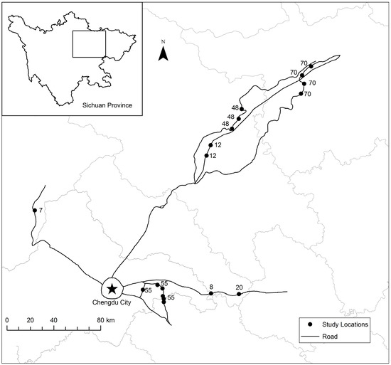 Map showing Sichuan Province in southwestern China (inset) and the 18 study locations within Sichuan Basin along major roadways near Chengdu City. Numbers indicate the period of time since road construction (i.e., years) for study locations. Gray lines represent county boundaries.