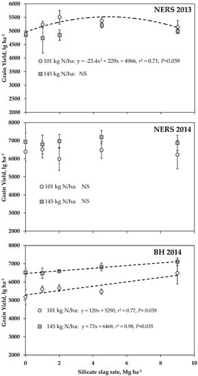 Grain yield of wheat applied with varying rates of silicate slag under sufficient and high N application rates NERS 2013, NERS 2014, and BH 2014. NS denotes no significant effect on yield; P values reported are for the regression model between yield and silicate slag for each N rate.
