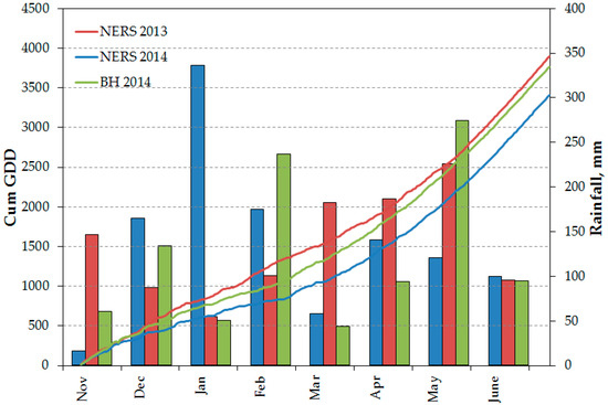 This study was conducted from 2012 to 2014 with a total of three site-years. The first site-year was established in 2012 at St. Joseph (Latitude 31°56′42.6″ N; Longitude 91°13′34″ W), Louisiana on a Commerce silt loam soil (fine-silty, mixed, superactive, nonacid, thermic Fluvaquentic Endoaquepts). In 2013, this study was established at two locations: (1) NERS, St. Joseph, Louisiana (Latitude 31°56′41.0″ N; Longitude 91°13′25.8″ W) on a field with Sharkey–Tunica–Newellton complex (very fine, smectitic, thermic Chromic Epiaquerts) and Commerce silt loam soil types and (2) BH (Latitude 30°21′40.4″ N; Longitude 91°10′01.9″ W) near Louisiana State University campus in Baton Rouge on a Cancienne silt loam soil (fine-silty, mixed, superactive, nonacid, hyperthermic Fluvaquentic Epiaquepts). All of these soils are found on the alluvial floodplain along the Mississippi River. Figure 2 summarizes the cumulative growing degree days and monthly rainfall distribution during the cropping season for each site-year. Nitrogen fertilizer was applied in February, and among the site-years, Ben Hur in 2014 received the highest amount of rain. In addition, the rate of accumulation of positive growing degree days was slower in this site-year compared to NERS 2013 and 2014.