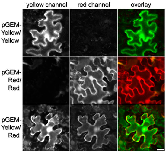 pGEMINI recombined vectors pGEM-(Red/Red), pGEM-(Yellow/Yellow) and pGEM-(Yellow/Red) were electroporated into A. tumefaciens strain GV3101. The A. tumefaciens strains were grown overnight at 28 °C in LB medium supplemented with 50 mg/L kanamycin, 25 mg/L hygromycin, 250 mg/L Rifampicin. Cells were harvested by centrifugation (4500 rpm, 4 °C), resuspended in K-MES buffer (10 mM 4-Morpholineethanesulfonic acid sodium salt; 10 mM MgCl2, pH 5.6) and 150 mM acetosyringone, and diluted to an optical density (OD600 nm) of 0.6. Cultures were allowed to incubate for 4 h at room temperature in K-MES prior to infiltration. The suspension of each Agrobacterium for each vector to be tested was mixed in a 1:1 ratio with an Agrobacterium suspension carrying a vector pBIN19-p19 containing p19, a viral suppressor of gene silencing. Two leaves from 4- to 5-week-old wild-type N. benthamiana plants were infiltrated using a needleless 1 mL syringe. The plants were allowed to develop in a plant growth room (12 h light, 12 h dark). The infiltrated leaves were analyzed for GFP and mRFP fluorescence by confocal microscopy 3 days after infiltration.