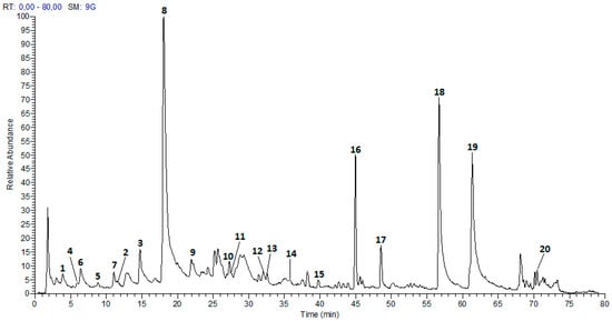 Finally, Peak 20 (Rt = 70.53 min) shows a negative molecular ion peak [M − H]− at m/z 193.0490, and MS2 fragments at m/z 178 [M − H-H2O], 149 [M − H-CO2], and 134 [M − H-H2O-CO2], corresponding to ferulic acid [36].