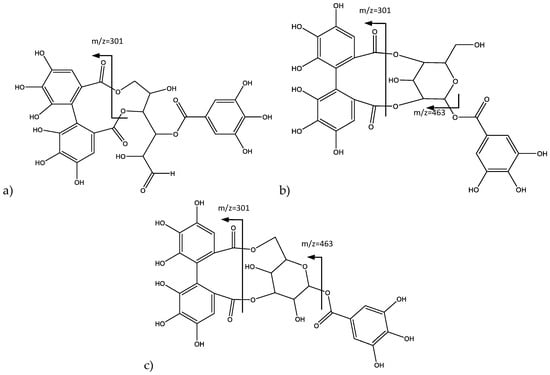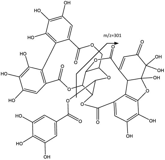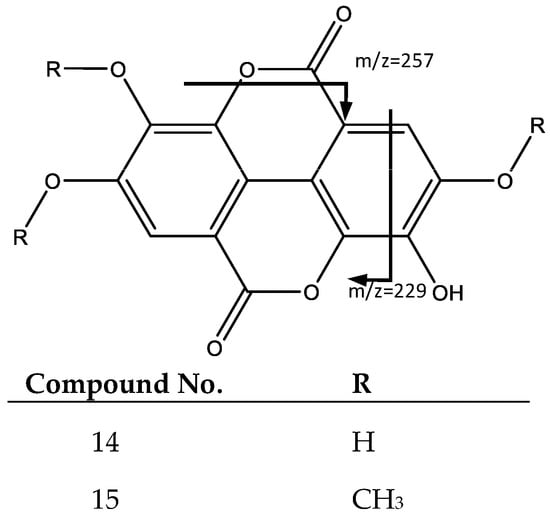 Peaks 14 and 15 have similar fragmentation patterns in agreement with an ellagic acid moiety, as shown in Figure 9. For instance, peak 14 (Rt = 35.75 min) corresponds to ellagic acid (14), which shows a negative molecular ion peak [M − H]− at m/z 300.9979, characterized by fragments at m/z 257 [M − H-CO2]− and m/z 229 [31]. In turn, Peak 15 (Rt = 39.74 min) shows a negative molecular ion peak [M − H]− at m/z 343.0443, and corresponds to O-trimethyl ellagic acid (15), whose fragments at m/z 328, 313, and 298 match the successive loss of methyl groups (–CH3) [32].
