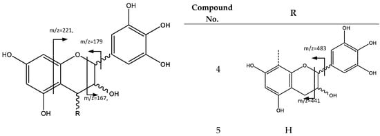 Peak 4 (Rt = 5.89 min) and peak 5 (Rt = 8.84 min) show negative molecular ion peaks [M − H]− at m/z 609.1242 (C30H25O14) and m/z 305.0657 (C15H13O7), respectively, corresponding to flavan-3-ol structures. In fact, peak 5 presents a fragmentation pattern common for an (epi)gallocatechin monomeric unit (5), because of characteristic fragments at m/z 261, 221, 219, 179, 167, 165, consistent with the loss of CO2, C4H4O2, C4H6O2, C6H6O3, C7H6O3, and C7H8O3, respectively. The loss of C4H4O2 and C4H6O2 occurs because of the fragmentation of the flavan-3-ol A ring. C6H6O3 loss is due to the fission of the heterocyclic ring, while neutral fragments C7H6O3 and C7H8O3 are released through a retro-Diels–Alder fission [23]. In turn, peak 4 corresponds to prodelphinidin B dimer (4), since the MS2 spectrum shows an ion at m/z 483, which is the product of the heterocyclic ring fission, while m/z 441 belongs to the retro-Diels–Alder fission, and further loss of water originates the fragment observed at m/z 423 [23], as shown in Figure 3.