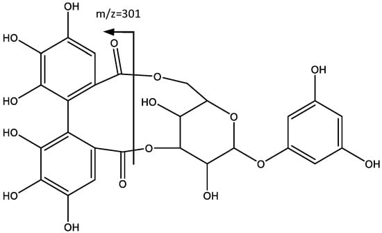 Peak 6 (Rt = 6.42 min) and peak 7 (Rt = 11.09 min) show negative molecular ion peaks [M − H]− at m/z 589.0815 (C26H21O16) and m/z 913.1857 (C45H37O21) respectively, with a similar fragmentation pattern in agreement with an ellagitannin structure, including 1,3,5-trihydroxybenzene and HHDP moieties. For instance, peak 6 shows (MS2 spectrum) a fragment at m/z = 301 [M − H-288], which undergoes further fragmentation in a pattern that matches that of the HHDP group [24,25]. The loss of 288 amu is consistent with a hexose bonded to an 1,3,5-trihydroxybenzene, which leads to the identification of the compound as 1′,3′,5′-trihydroxybenzene 1′-O-[4,6-(S)-HHDP]-β-glucoside (6), as shown in Figure 4 [26].