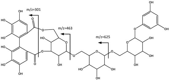 In a similar way, peak 7 shows fragments at m/z 301 that indicate the presence of the HHDP unit. As shown in Figure 5, the MS2 fragment at m/z 625 ([M − H]-288) is consistent with the loss of a glucose molecule bonded to a 1,3,5-trihydroxybenzene. Further losses of 162 amu at m/z 463 [M − H-288-162] and m/z 301 [M − H-288-162-162] are due to the loss of additional hexoses. Therefore, the compound is tentatively identified as 1′,3′,5′-trihydroxybenzene 1′-O-[4,6-(S)-HHDP-β-glucosyl-β-glucosyl]-β-glucoside (7).
