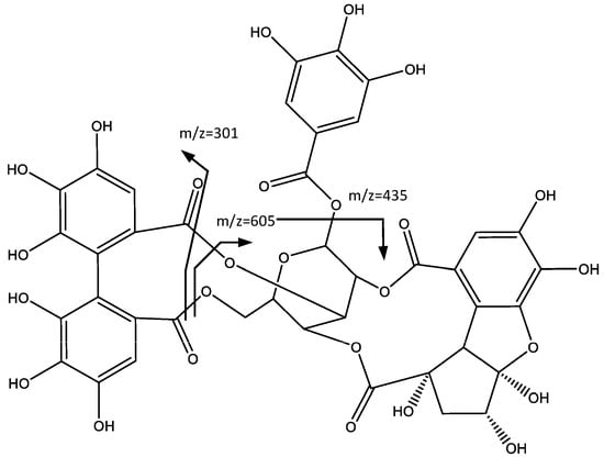 Peak 9 (Rt = 21.92 min) shows a negative molecular ion peak [M − H]− at m/z 925.0905, and it is tentatively assigned to ellagitannin Phyllanthusiin C (9), whereas the peak at m/z 907 is due to the water loss in the geminal alcohol, which after further loss of HDDP, forms the fragment at m/z 605, as shown in Figure 7. The additional loss of a galloyl group originates the fragment at m/z 435. The peak at m/z 301 corresponds to the ionized HDDP unit [25].