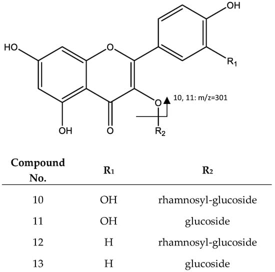 Structure and fragments of quercetin derivatives (10), (11), and kaempferol derivatives (12), (13).