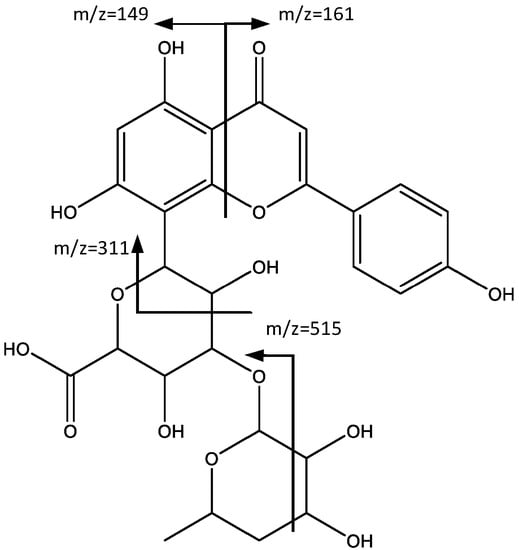 Peaks 16 (Rt = 44.98 min) and 17 (Rt = 48.55 min) correspond also to flavonoids, specifically to apigenin and chrysin derivatives. In fact, peak 16 showed a negative molecular ion [M − H]− at m/z 575.1381 (C27H27O14), and a fragment at m/z 515 corresponding to [M − H-60] which was previously reported [33] for this type of structure (Figure 10). According to Wu et al. [34], the fragment observed at m/z 311 corresponds to apigenin derivative (16). The fragment at m/z 293 arose from the successive loss of water. Two more peaks, observed at m/z 161 and m/z 149, originated from the fragment identified at m/z 311, due to the breakdown of the C ring, with each peak corresponding to one of the fragments generated.