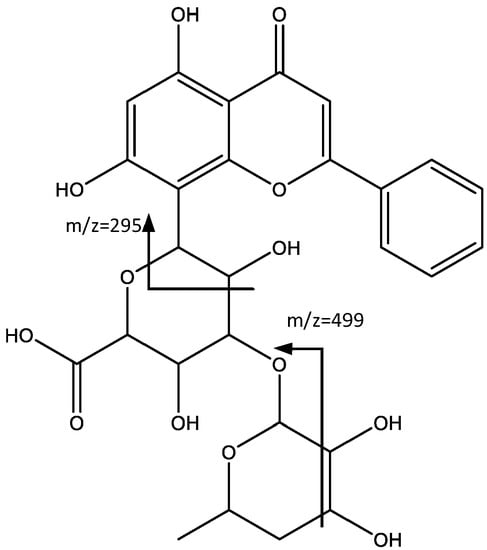 In a similar way, peak 17 shows a negative molecular ion peak [M − H]− at m/z 559.1428 (C27H27O13), which in turn shows a fragmentation pattern similar to the previous peak. For instance, the peak at m/z 499 originating from the loss of 60 amu [M − H-60] [33], and the peak at m/z 295, arises from a fragmentation similar to the one described by Wu et al. [34], with an oxygen in the aglycone instead of the glycoside, which leads to the tentative identification of chrysin (17) as aglycone (Figure 11).