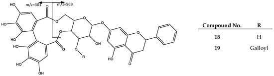 Peaks 18 and 19 were assigned to ellagitannin derivatives of flavanone pinocembrin, previously reported in the genus Phyllanthus [6]. In fact, peak 18 (Rt = 56.67 min) shows a negative molecular ion peak [M − H]− at m/z 719.1230 (C35H27O17), and was assigned to Pinocembrin 7-O-[4″,6″-(S)-hexahydroxydibenzoyl]-b-d-glucopiranoside (18), for which the main fragment at m/z = 301 corresponds to the HDDP group [35]. Peak 19 (Rt = 61.31 min) shows a negative molecular ion peak [M − H]− = 719.1230 (C42H31O21) consistent with Pinocembrin 7-O-[3″-O-galloyl-4″,6″-(S)-hexahydroxydibenzoyl]-β-d-glucopiranoside (19), which besides the fragment at m/z 301 previously explained, exhibits fragments at m/z 569 due to HDDP loss, and at m/z 827 after the loss of a CO2 molecule, as shown in Figure 12 [25].